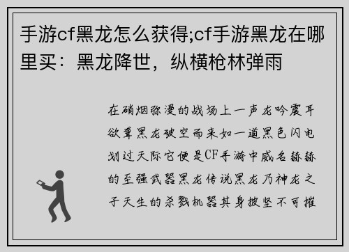 手游cf黑龙怎么获得;cf手游黑龙在哪里买:黑龙降世,纵横枪林弹雨